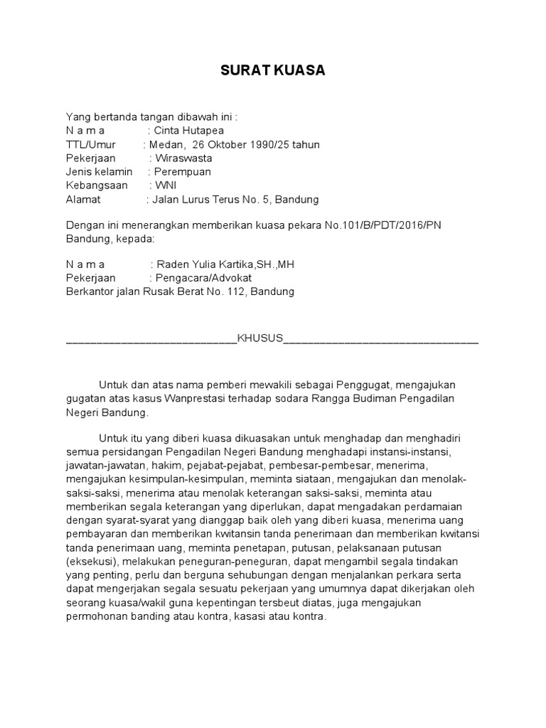 Contoh Surat Kuasa Khusus Perdata Wanprestasi - Kumpulan Surat Penting